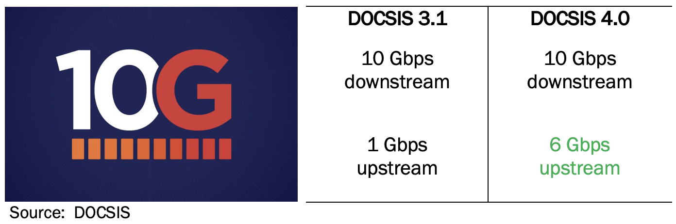 A second source of growth is investment in DOCSIS upgrades. Most cable operators have tested this “10G” service extensively in their labs over the past several years, with some progressing to field testing as compatible equipment upgrades to amplifiers and modems became available. Symmetrical Gigabit grade service will allow cable to compete with symmetrical fiber-to-the-home (FTTH) offerings and provide a path to higher speeds and prices.